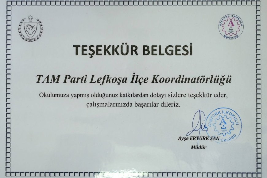 TAM PARTİ Lefkoşa İlçe Koordinatörlüğü tarafından düzenlenen Yılbaşı Pazarı etkinliğinde elde edilen stant kira gelirleri ile alınan hediyeler Lefkoşa’da ilkokullara destek olarak teslim edildi. Atatürk İlkokulu Müdürü Ayşe Ertürk Şan, TAM PARTİ’ye katkılarından dolayı teşekkür belgesi takdim etti.