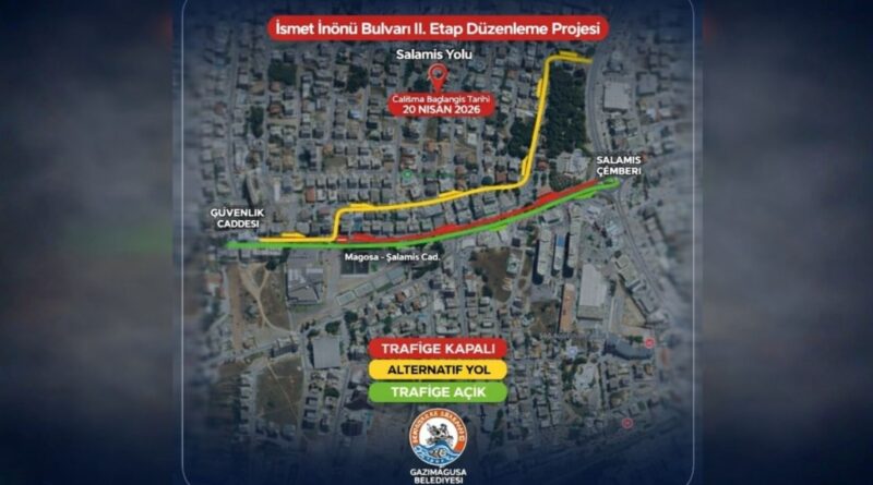 Gazimağusa Belediyesi tarafından yürütülen İsmet İnönü Bulvarı (Salamis Yolu) 2. Etap Düzenleme Projesi kapsamında, yarın başlayacak yol çalışmalarından etkilenecek yollar ve düzenlemeleri açıkladı.