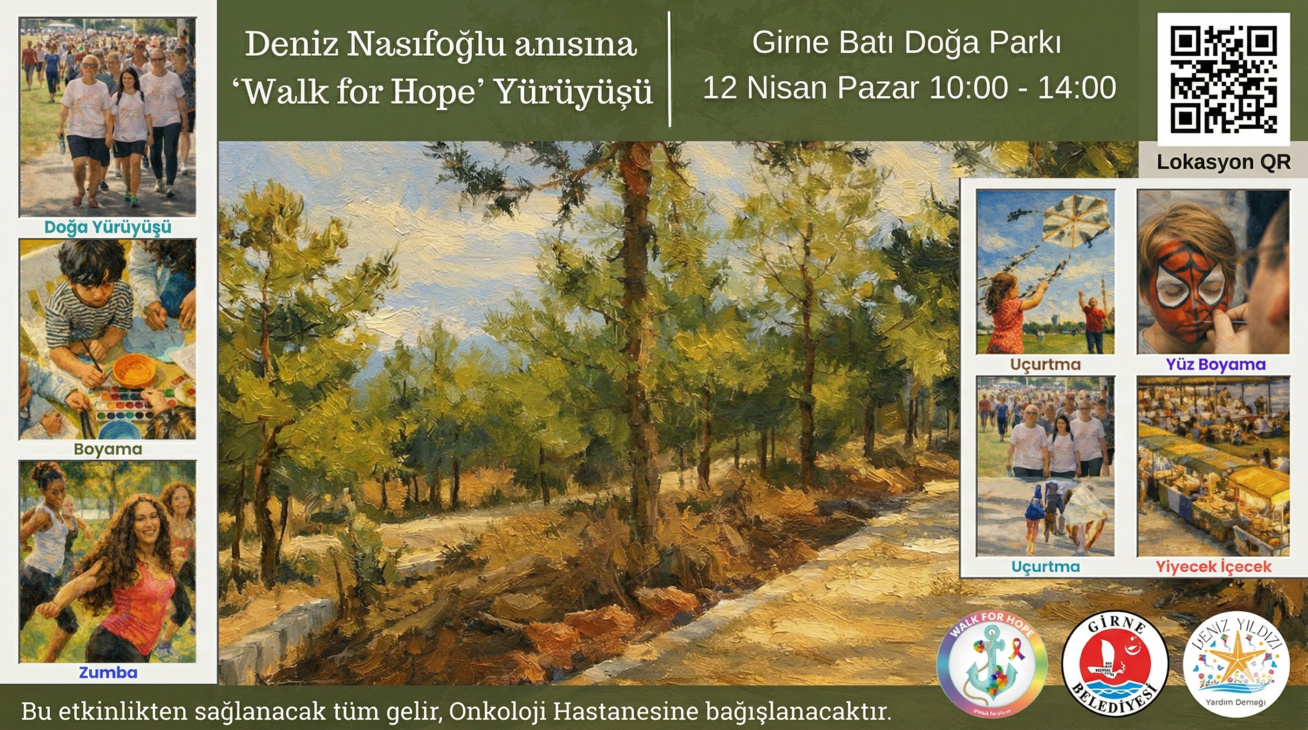 Bu yıl dördüncü kez organize edilen ve merhum Deniz Nasıfoğlu anısına yapılacak ‘Walk for Hope’ yürüyüşü, 10.00 ile 14.00 saatleri arasında Girne Batı Doğa Parkı’nda gerçekleştirilecek. Etkinlikten elde edilecek tüm gelir, onkoloji hastalarına destek amacıyla bağışlanacak.
